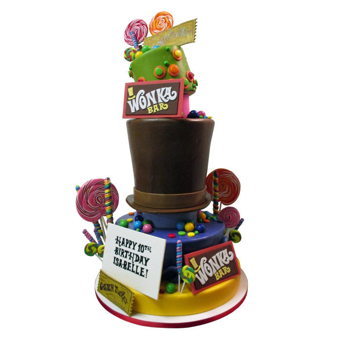 Chocolate covered Wonka top hat and all, this Wonka inspired candyland cake is a unique combination of cake, frosting and candy, custom made by City Cakes.