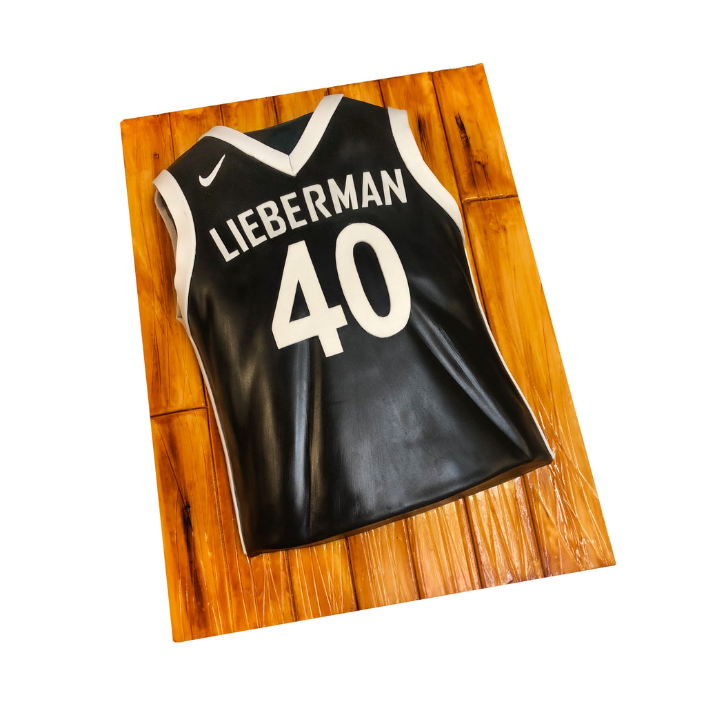 A customized basketball jersey cake can be created with any name, number and color scheme. This Nothing But Jersey Cake was created for a special 40th Birthday. Carved from cake and created by City Cakes, this custom piece is available for delivery in the tri-state area!