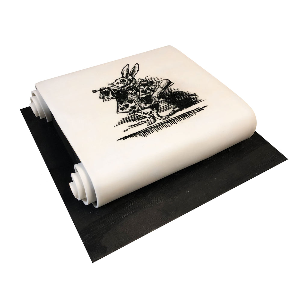 This 60th birthday cake was custom created to replicate the original scroll illustration by John Tenniel. Hand painted on sugar, the iconic white rabbit is from the Lewis Carroll’s book, Alice’s Adventures in Wonderland.