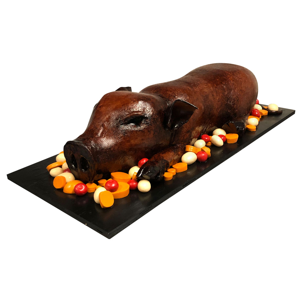 A Pig Roast in cake form. This masterpiece was hand sculpted by the talented decorating team at City Cakes and textured with powdered sugar colors. The sugar detailed veggies around the sides will fool anyone into thinking they’re walking into a full Luau party.