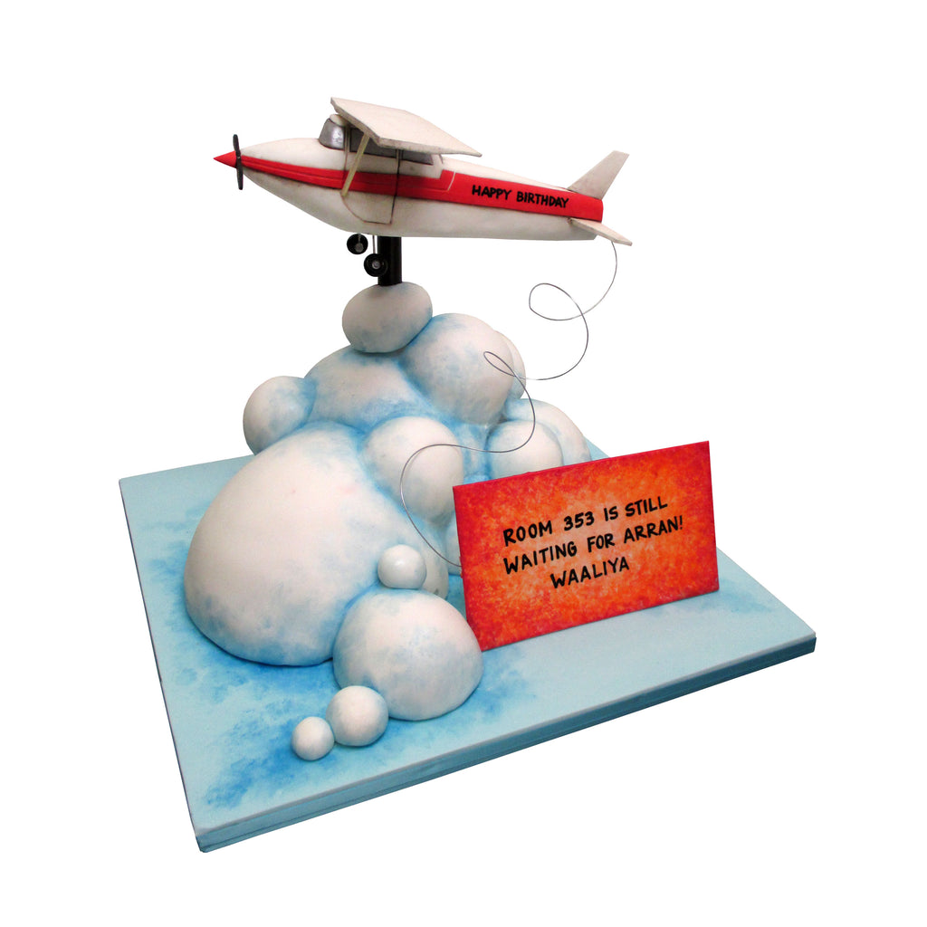 This classic sugar plane flies high above the cloud of cakes, bringing along a message and delicious treat! Custom sculpted and hand painted by City Cakes.