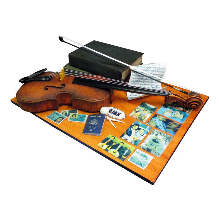 This custom cake combines Viola, Books and many mementos including edible images and symbols of a life journey full of delicious cake from City Cakes in NYC.