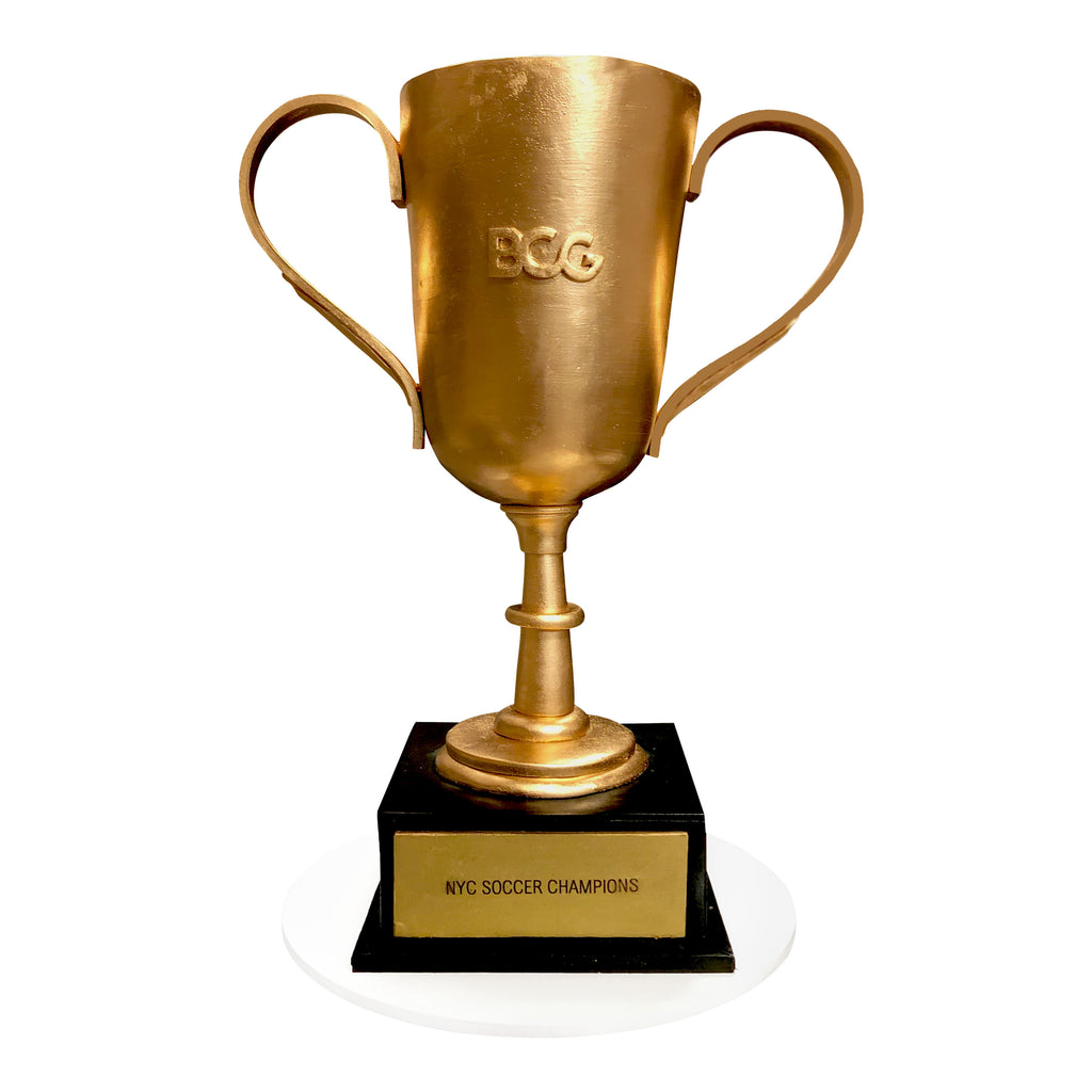 This trophy cake was made in celebration of BCG’s championship win. Hand carved out of cake by City Cakes and covered in fondant, this centerpiece was hand painted in edible gold paint.