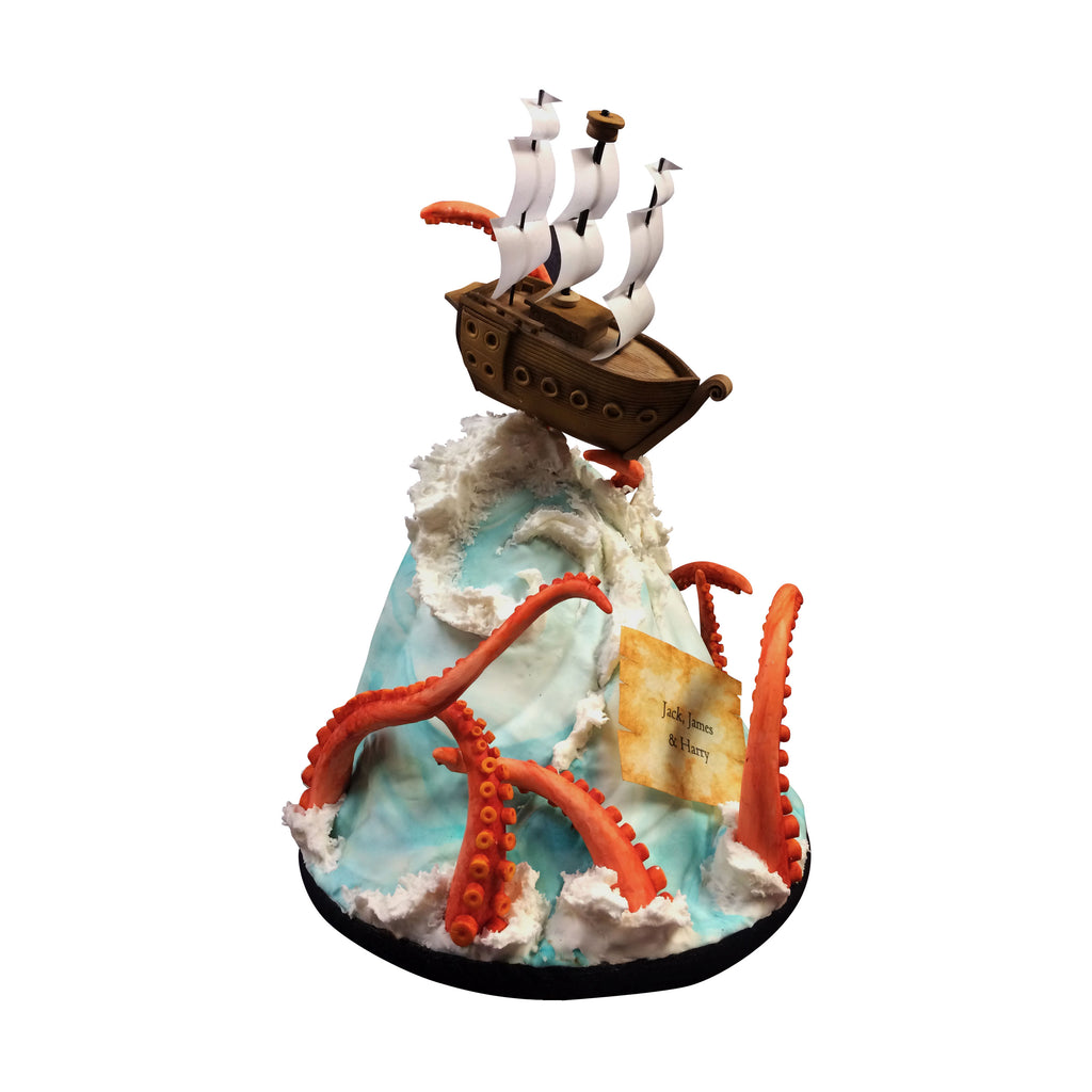 When Tentacles Attack is a custom cake created by City Cakes. The stormy waves, built of cake, and the menacing sugar tentacles create quite a sea adventure for the sugar ship with edible sails perched on top. Hold on tight...there are rough seas ahead! This awesome cake is customizable and available within driving distance from NYC!